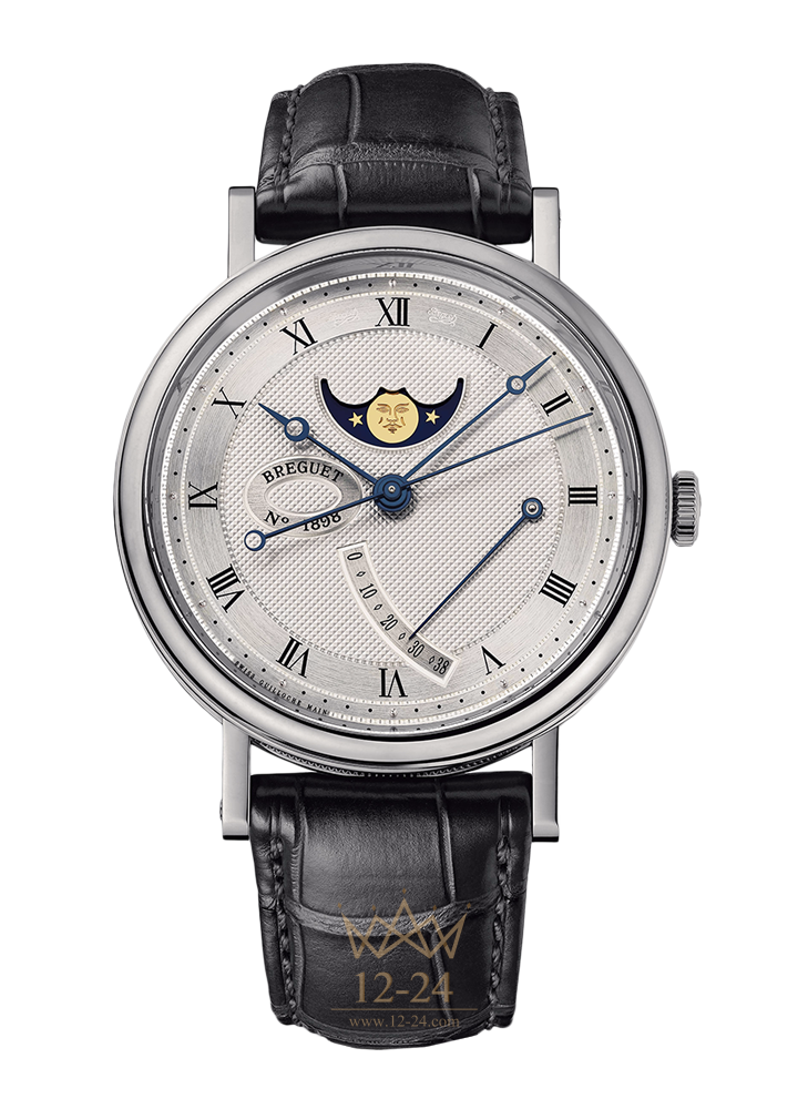 Часы линии Classique из белого золота. Автоматический механизм с указателями запаса хода, фаз Луны и лунного цикла. Спираль, анкер и анкерное колесо из кремния. Циферблат из посеребренного золота с гильошированным вручную узором, с римскими цифрами Breguet и секретной подписью. Задняя крышка из сапфирового стекла. Водонепроницаемые до 3 бар (30 м). Диаметр: 39 мм.