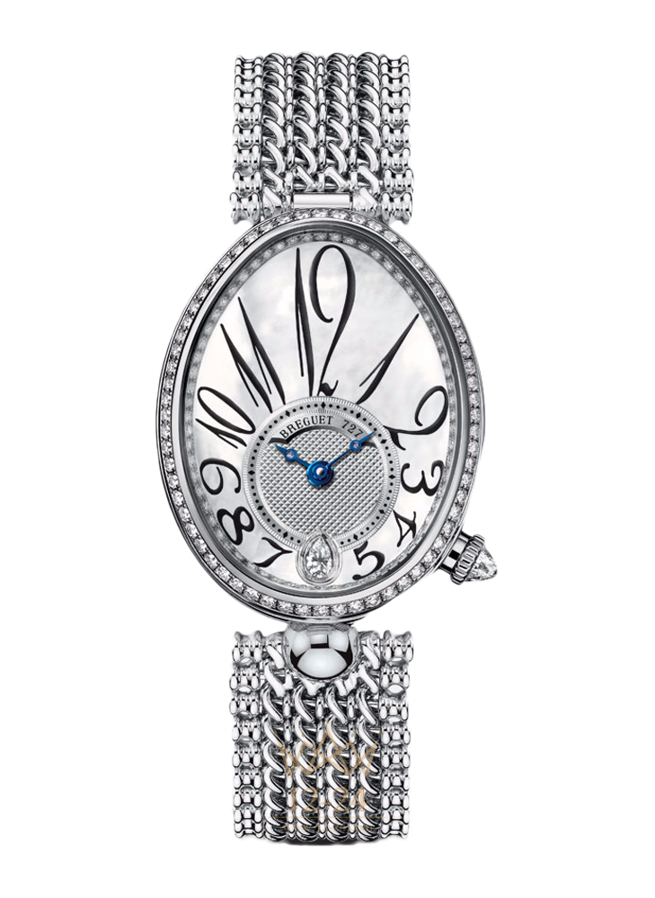 Индивидуальный номер и надпись Breguet Часовая шкала представлена арабскими цифрами Breguet, смещающимися к положению «6 часов». На отметке «6 часов» расположен бриллиант грушевидной огранки (весом около 0,09 карат). Стрелки Breguet с открытым наконечником из вороненой стали. Механизм с автоподзаводом, калибр 537/3. Номер и надпись Breguet 8¾ линий. 26 камней. Запас хода 45 часов. Анкерное колесо и однорядный швейцарский спусковой механизм из кремния. Кремниевая спираль Частота колебаний балансира составляет 3,5 Гц. Механизм отрегулирован в 6 положениях.