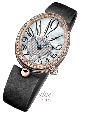 Часы Reine de Naples из 18-каратного розового золота. Автоматический механизм. Гильшированный циферблат из посеребренного 18-каратного золота, вставка из натурального белого перламутра в положении "6 часов". Приподнятый безель, украшенный 117 бриллиантами (около 0,99 карата). Заводная головка украшена бриллиантом весом 0,26 карата. Арабские цифры BREGUET. Бриллиант огранки "груша" в положении "6 часов". Задняя крышка из сапфирового стекла.