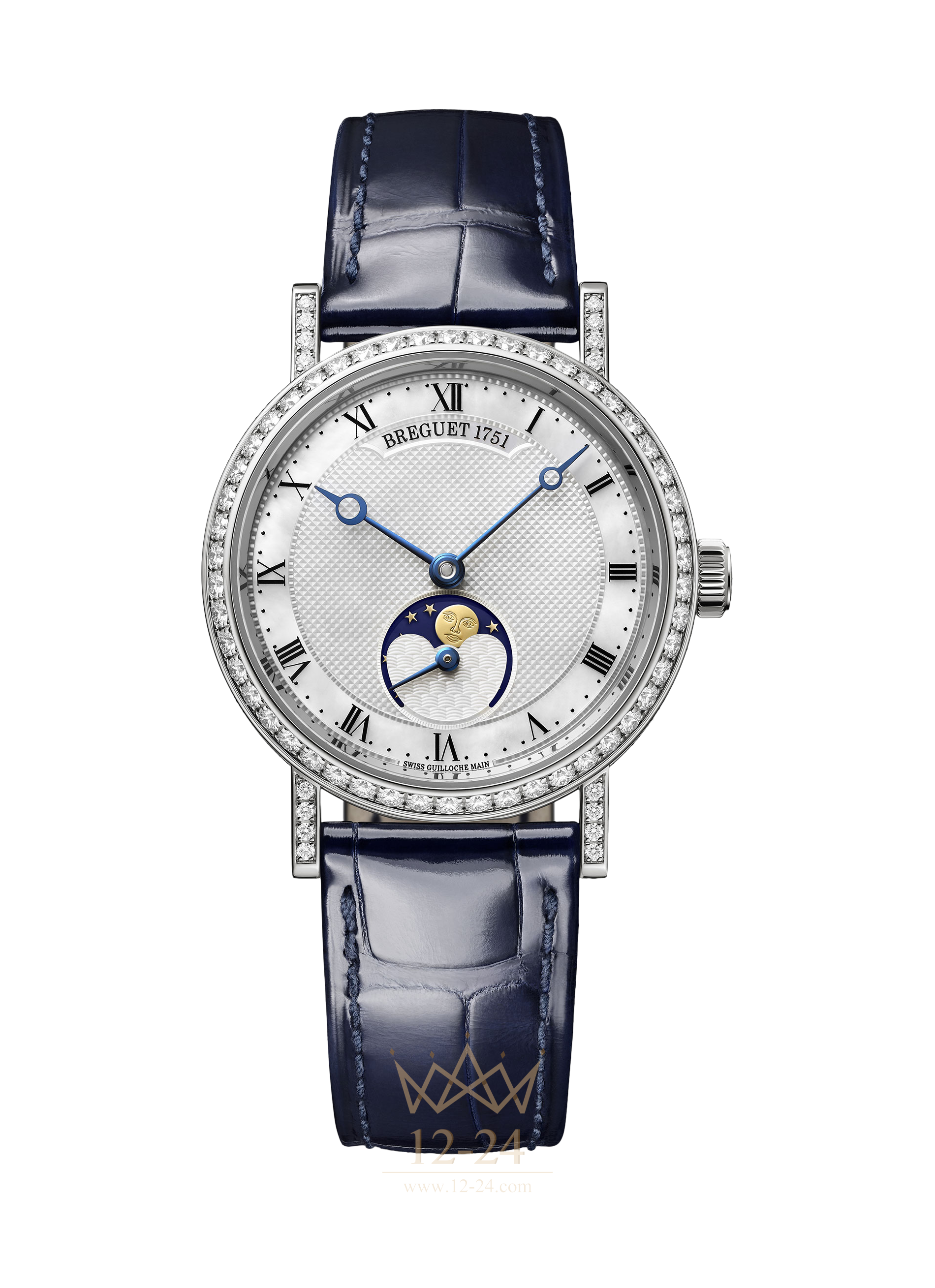 Индивидуальный номер и подпись Breguet. Обозначение часов арабскими цифрами. Индикатор фаз Луны, апертура маленьких секунд в положении «на 6 часах». Вороненые стрелки Breguet с наконечником в форме «яблоко».