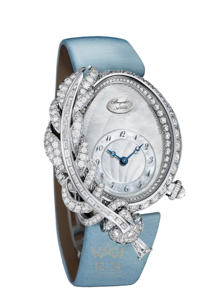 Циферблат из гильошированного натурального перламутра. Медальон Breguet на 12:00. Циферблатное кольцо с римскими цифрами. Стрелки Breguet с открытыми наконечниками из вороненой стали.