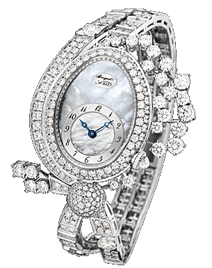 Часы из 18-каратного белого золота с бриллиантами (около 19 каратов, TW/IF-VVS). Циферблат из 18-каратного посеребренного золота и натурального перламутра. Смещенная часовая шкала с арабскими цифрами Breguet. Автоматический механизм. Ротор из платины 950 пробы с гильошированным вручную узором.