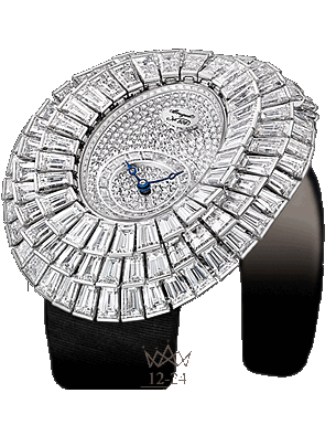 Часы Crazy Flower категории "Высокое ювелирное искусство" из 18-каратного белого золота. Корпус оформлен 116 подвижными бриллиантами огранки "багет" (34,57 карата, TW/IF-VVS). Изогнутый циферблат с закругленными стрелками, индивидуальным номером и надписью Breguet украшен 206 перевернутыми бриллиантами (0,80 карата, TW/IF-VVS) и 20 бриллиантами огранки "багет" (0,46 карата, TW/IF-VVS).