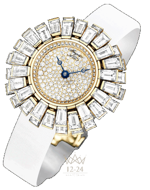 Часы Petite Fleur категории "Высокое ювелирное искусство" из 18-каратного желтого золота. Корпус украшен 43 подвижными бриллиантами огранки "багет" (12,56 карата). Изогнутый циферблат со стрелками с наконечниками в форме яблока украшен 141 бриллиантом в форме снежинок (0,52 карата, TW/IF-VVS). Ободок украшен 48 перевернутыми бриллиантами классической огранки (0,1 карата). Браслетная застежка белого атласного ремешка украшена 26 бриллиантами (0,08 карата, TW/IF-VVS).
