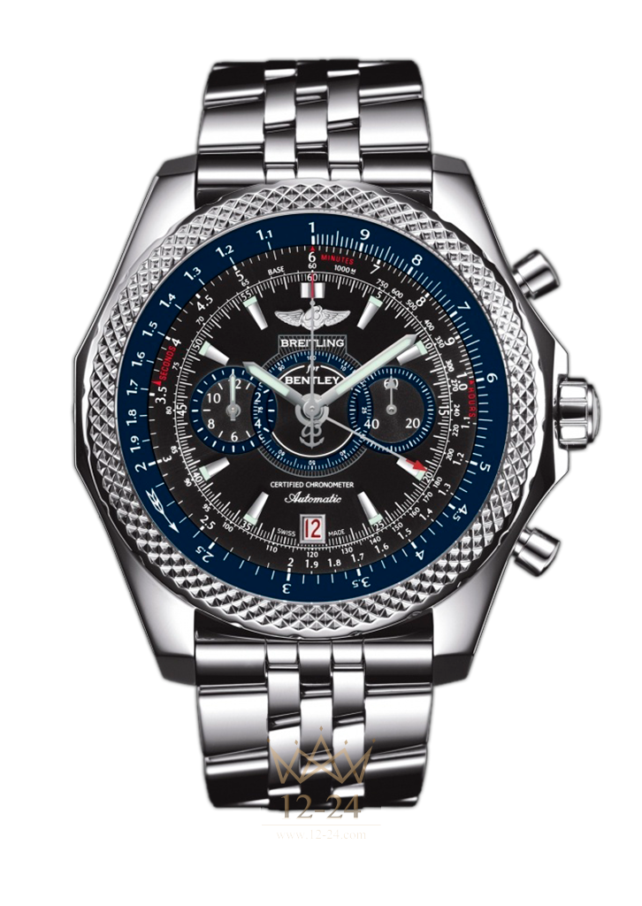 В честь Bentley Continental Supersports, самой быстрой, мощной и маневренной дорожной модели в истории Bentley, Breitling for Bentley предлагает эксклюзивную модель хронографа в 1000 экземпляров, столь же роскошную, стильную и эффективную. Для Bentley Supersports характерен черный циферблат с синим внутренним безелем. В прочном, но по-спортивному легком стальном корпусе бьется сердце хронографа с автоподзаводом, который сертифицирован как хронометр и дополнен центральным 60-минутным счетчиком. Такая необычная особенность позволяет с легкостью считывать показания в минутах, чему способствует броский красный наконечник стрелки. Он отмеряет время и по 12-часовому счетчику, расположенному напротив метки «9 часов», и по центральной шкале, где счет идет на сотые доли часа или минуты. Кроме того, на циферблате располагается эксклюзивная система «переменного тахометра», который служит для расчета средней скорости независимо от истекшего времени, пройденного расстояния или набранной скорости. А браслет надежно крепит Bentley Supersports к запястью владельца. Супермашине – суперхронограф!