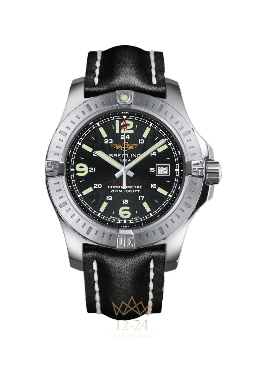 В полированный стальной корпус Colt Quartz, оснащенный матовым безелем, установлен механизм Breitling SuperQuartz™, являющийся вершиной электронных технологий, в десять раз более точный, чем стандартный кварцевый. Черный, синий или серебристый циферблат обеспечивает большую легкость восприятия, благодаря четырем большим часовым меткам и стрелкам, на которые нанесено люминесцентное покрытие. Прочная конструкция, завинчивающая головка подзавода и толстое сапфировое стекло (защищенное от бликов c обеих сторон) гарантируют водонепроницаемость до глубины в 200 м (660 футов).