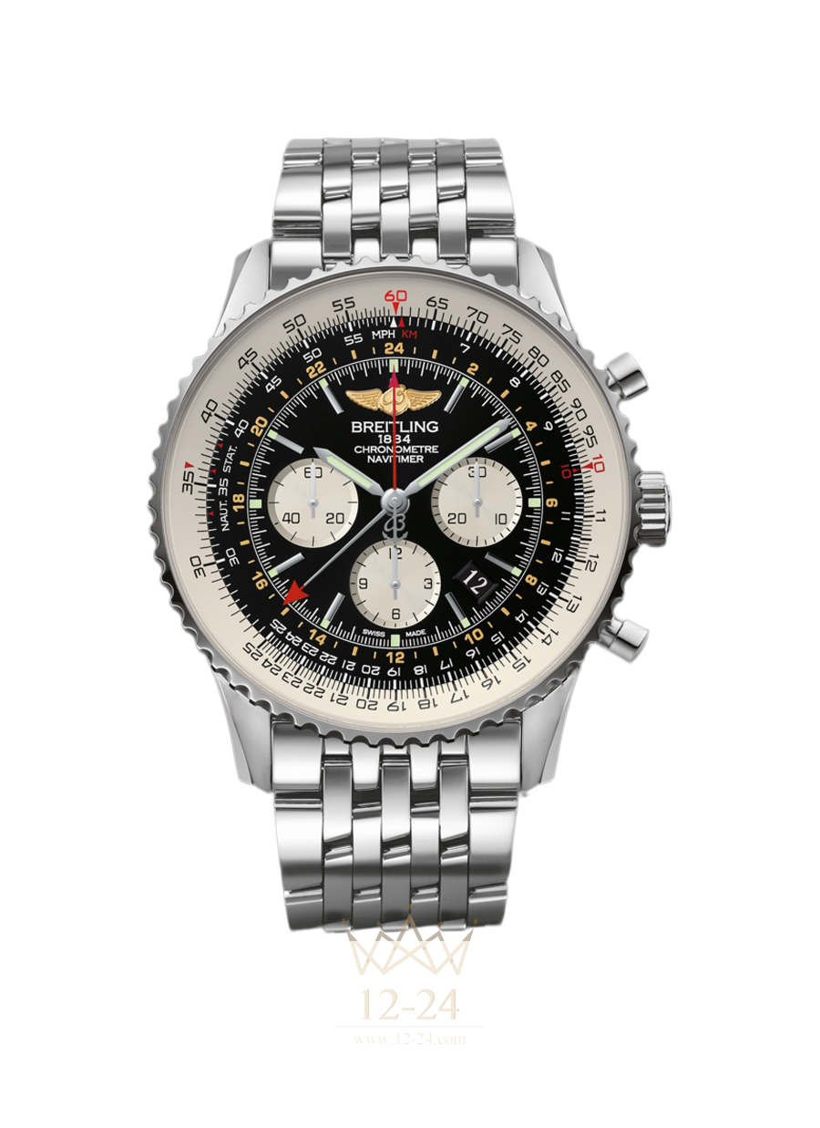 При создании этого хронографа с душой путешественника компания Breitling решила мыслить масштабно. Эта модель сочетает удобство и изобретательность мануфактурного калибра Breitling B04, который можно увидеть через прозрачную заднюю крышку; также она имеет революционную систему отображения времени в двух часовых поясах полностью регулируемую с помощью рукоятки подзавода. Крупный стальной корпус грандиозного диаметра в 48 мм дополняет исключительно понятная «приборная панель». Оснащенные знаменитой авиационной логарифмической линейкой, часы Navitimer GMT также доступны в ограниченной версии из красного золота. Новые горизонты для легендарной модели.