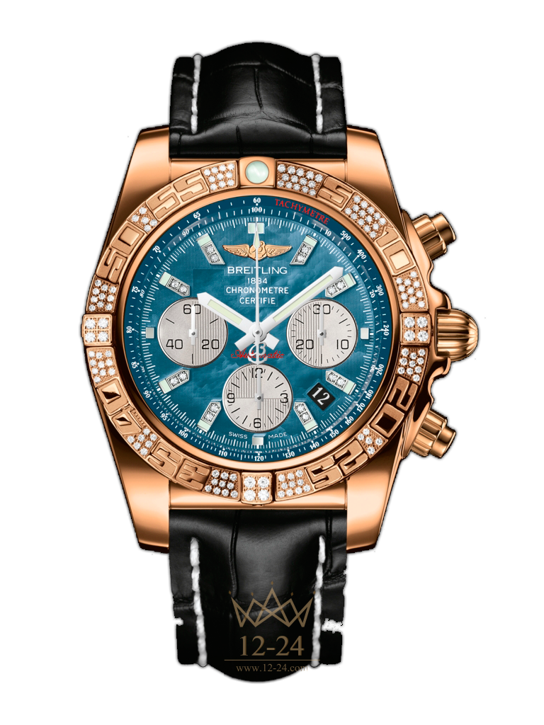 Бриллиантовая серия не имеющая равных, модель из коллекций фирмы Breitling, Chronomat 44 несёт в себе отпечаток целой вселенной, где царят превосходное качество, спортивные достижения и стремление превзойти границы личных возможностей. Прочный корпус, в котором размещён мануфактурный механизм механизм Breitling Caliber 01 сохраняет водонепроницаемость на глубине до 100 м – достойные часы для ныряльщика. Этот хронограф, обладающий уникальным стилем, настоящий инструмент авиатора. Корпус из розового золота с бриллиантами, синий жемчужный циферблат с бриллиантами на часовых метках, черный ремешок из кожи аллигатора.