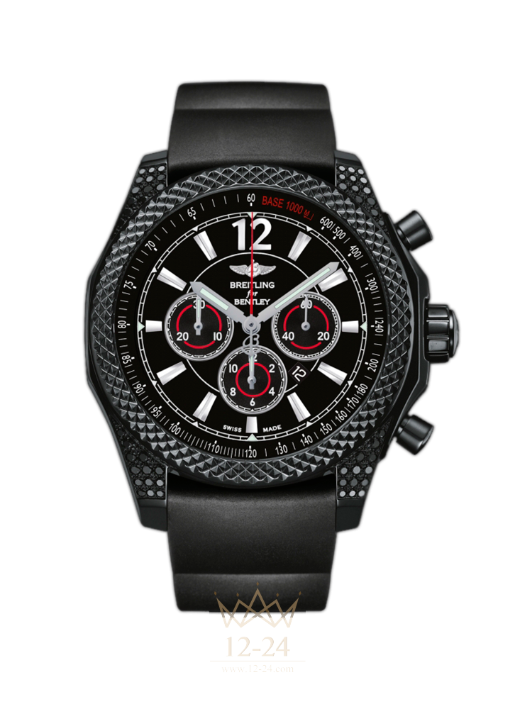 Это также и название исключительного хронографа, соединяющего в себе безупречный стиль с несравненными характеристиками. Теперь Breitling for Bentley выпускает ограниченную серию этой спортивной модели, полностью облаченную в черное – от стального корпуса инкрустированного бриллиантами, цвета ночи, которого удалось добиться благодаря углеродной обработке, обеспечивающей высокую прочность, до циферблата и до мягкого и прочного каучукового ремешка. Внешний вид «приборной панели» подкрепляется хромированными сумматорами со стальными ободками, красными акцентами и тахометрической шкалой на внутреннем безеле. Крупный размер безеля также подчеркивает эффект элегантного выпуклого орнамента из насечек по мотивам известных радиаторных решеток Bentley. Крупные часовые отметки и увеличенные стрелки, украшенные люминесцентным покрытием, позволяют легко определить время в любых условиях, даже в самый разгар действия. Эта пламенная и сложная спортивная модель оснащена механизмом хронометра с автоподзаводом, прошедшим официальную сертификацию в COSC, что является неоспоримым свидетельством точности и надежности.