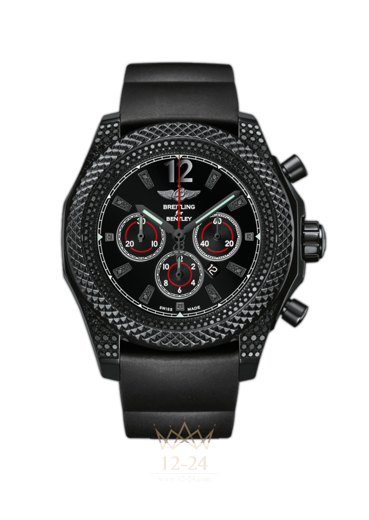 Это также и название исключительного хронографа, соединяющего в себе безупречный стиль с несравненными характеристиками. Теперь Breitling for Bentley выпускает ограниченную серию этой спортивной модели, полностью облаченную в черное – от стального корпуса инкрустированного бриллиантами цвета ночи, которого удалось добиться благодаря углеродной обработке, обеспечивающей высокую прочность, до циферблата и до мягкого и прочного каучукового ремешка. Внешний вид «приборной панели» подкрепляется хромированными сумматорами со стальными ободками, красными акцентами и тахометрической шкалой на внутреннем безеле. Крупный размер безеля также украшенного бриллиантами подчеркивает эффект элегантного выпуклого орнамента из насечек по мотивам известных радиаторных решеток Bentley. Крупные часовые отметки украшены бриллиантами, увеличенные стрелки украшенные люминесцентным покрытием, позволяют легко определить время в любых условиях, даже в самый разгар действия. Дополняет все это черный каучуковый ремешок с кнопочной застежкой. Эта пламенная и сложная спортивная модель оснащена механизмом хронометра с автоподзаводом, прошедшим официальную сертификацию в COSC, что является неоспоримым свидетельством точности и надежности.