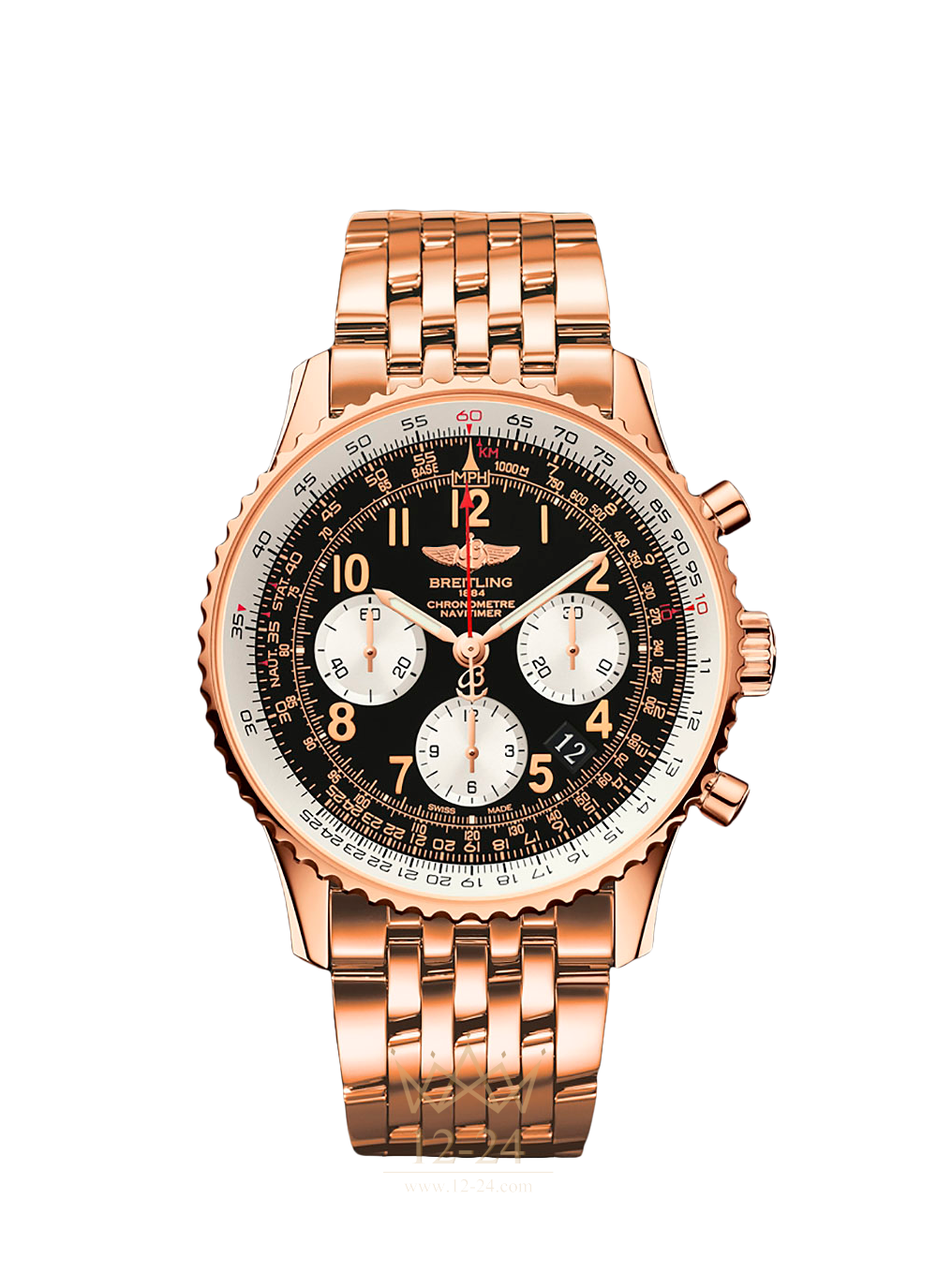 Мануфактурный механизм Breitling Caliber 01, с запасом хода в 70 часов на 47 камнях с частотой полуколибаний 28800 кол./час. Циферблат черный с белыми счетчиками хронографа и метками (1/4 секунды центральная секундная стрелка, 30 минут в положении на 3 часа, 12 часов в положении на 6 часов). В положении на 9 часов малая секундная стрелка часов, Арабские цифры вместо меток. Браслет из розового золота.
