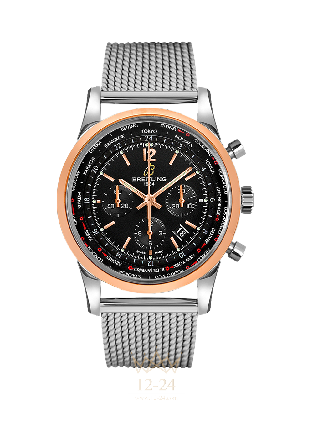 Этот хронограф с функцией мирового времени в матовом стальном корпусе с мануфактурным калибром Breitling B05 обладает черно-белым техничным обликом и следует великим традициям Breitling по изготовлению часов для авиаторов. Циферблат позволяет одновременно увидеть время во всех 24 часовых поясах, к чему добавлена крайне практичная система управления настройками при помощи заводной головки, а также автоматическая коррекция даты по местному времени в обоих направлениях. Можно выбрать отделку этого инструмента — синий циферблат, корпус красного золота, а также модель из ограниченной серии “Blacksteel” в черной стали. Абсолютное удобство для пользователя.