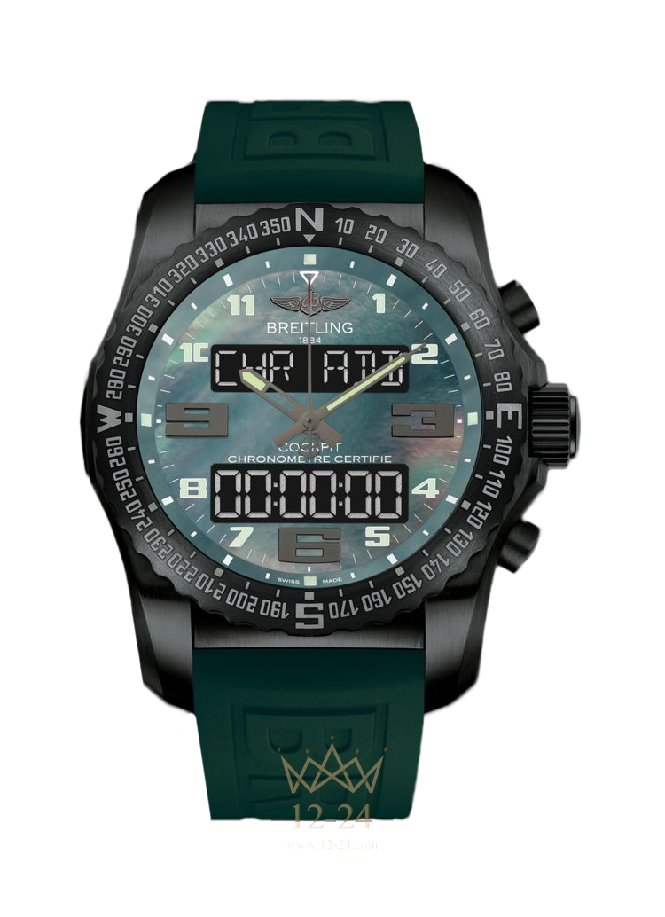 Идеальный инструмент для пилота, многофункциональный электронный хронограф отличается титановым корпусом, который оснащен эксклюзивным электронным калибром Breitling B50: специально разработанным для авиации механизмом SuperQuartz™ с аналоговым и цифровым дисплеями. В число его инноваций также входит облегчающий восприятие информации дисплей, высочайшая простота в обращении и широкий набор функций. В версии «Night Mission» часы Cockpit B50 выполнены в черном титановом корпусе с углеродным напылением с высокой устойчивостью, а также с резиновым ремешком. Исключительный дизайн инструмента высокого качества.