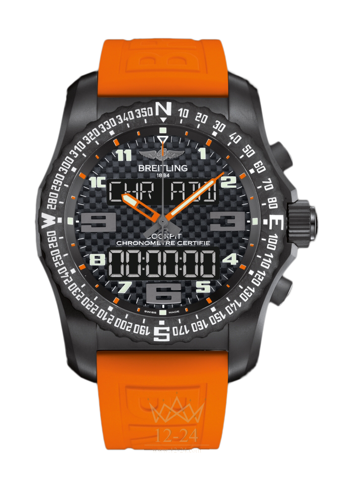 Идеальный инструмент для пилота, многофункциональный электронный хронограф отличается титановым корпусом, который оснащен эксклюзивным электронным калибром Breitling B50: специально разработанным для авиации механизмом SuperQuartz™ с аналоговым и цифровым дисплеями. В число его инноваций также входит облегчающий восприятие информации дисплей, высочайшая простота в обращении и широкий набор функций. В версии «Night Mission» часы Cockpit B50 выполнены в черном титановом корпусе с углеродным напылением с высокой устойчивостью, а также с резиновым ремешком. Исключительный дизайн инструмента высокого качества.