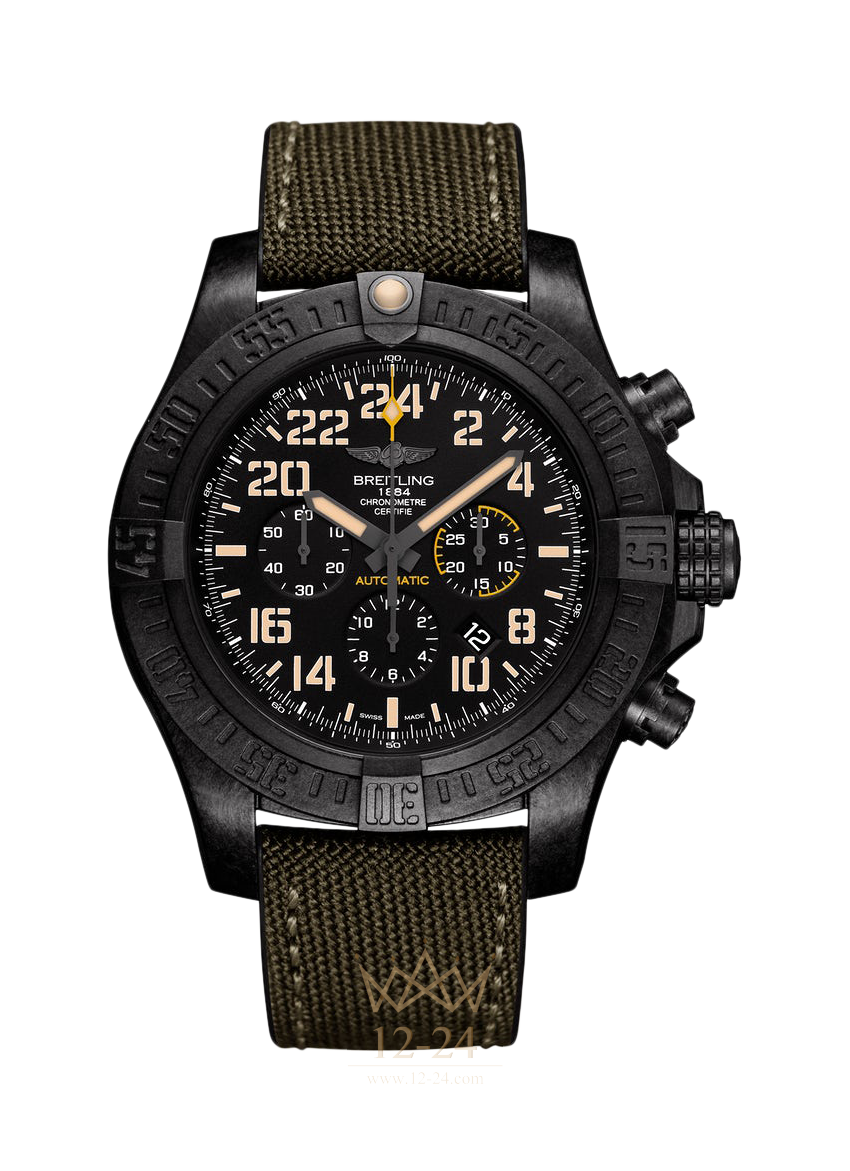 Avenger Hurricane Military, выпущенный в количестве 1000 экземпляров лимитированной серии, с его ультра-прочным, ультра-легким 50 мм корпусом из Breitlight® (первым в мире) и с его мануфактурным калибром Breitling B12, работающим с эксклюзивным 24-часовым циферблатом, гордо представляет возможности инструмента, для которого совершенство — это норма. Черный циферблат украшают люминесцентные стрелки и цифры желто-бежевого цвета с эффектом легкой патины, напоминающие о приборах, выпускавшихся Breitling в 1940-х – 1960-х годах — это напоминание о давнем наследии бренда в воздухоплавательной и военной сфере.