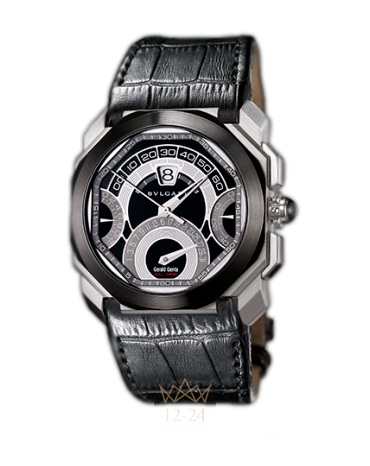 Мануфактурный хронограф с автоматическим подзаводом, калибр GG 7800 с жемчужным зернением, скошенными кромками и отделкой под старинное золото. Четыре ретроградных указателя. Запас хода 38 часов. Корпус из стали, диаметр 45 мм, безель из черной керамики, прозрачная задняя крышка, заводная головка с кабошоном из керамики. Лакированный циферблат с отделкой выемчатой эмалью. Ремешок из кожи аллигатора, раскладывающаяся застежка из стали. Водонепроницаемость до 100 метров.