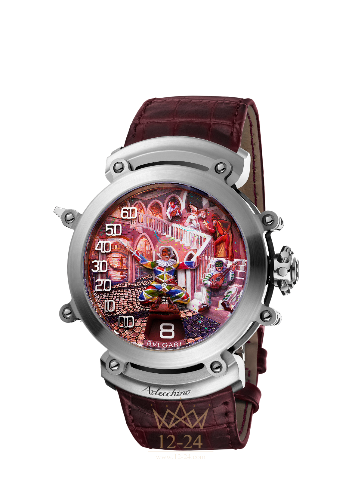 Циферблат из золота 18 карат, ручная отделка в технике гравирования, чеканки и миниатюрной живописи. На циферблате изображена типичная обстановка итальянского палаццо XVI века с видом на мост Риальто в Венеции. 5 знаменитых персонажей комедии дель арте играют на музыкальных инструментах и поют. Ремешок из кожи аллигатора, раскладывающаяся застежка из белого золота 18 карат. Ограниченная серия из 8 экземпляров.