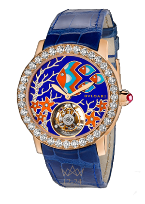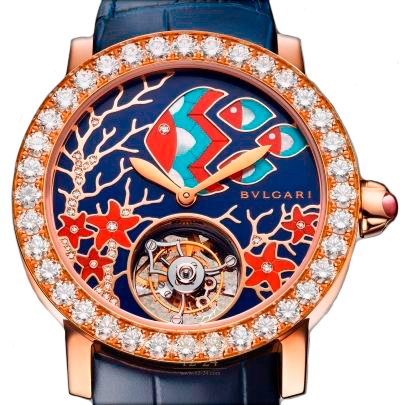 Этим летом ювелирный дом Bvlgari предложил своим поклонникам погрузиться в загадочный подводный мир вместе с новинкой этого часового сезона под названием Il Giardino Marino. Изюминка часов – искусное сочетание живописной миниатюры со сложным механизмом турбийона. Опирающийся на абсолютно прозрачный сапфировый мост турбийон просматривается в круглом окошке, похожем на иллюминатор субмарины, которая отправилась изучать тайны красочного подводного мира. Запас хода платинового калибра BVL 263 с инерционным грузом из 22-каратного золота обеспечивает часам 64 часа автономной работы. Механизм часов подобен жемчужине, красота которой скрыта за створками раковины. Потрясающее изящество механики Bvlgari раскрывается, благодаря ловким и опытным рукам мастеров-ремесленников, занятых на производстве. Детали механизма украшены Женевскими волнами и жемчужным зернением тонкой работы. Все эти декоративные тонкости скрыты в 37- миллиметровом корпусе из розового золота. Безель модели инкрустирован 36-ю искусно ограненными бриллиантами весом 2,88 карата. Синий лакированный циферблат с узором в виде рыбок из бирюзы, коралла и перламутра, бриллианты классической огранки. Ремешок из кожи аллигатора, классическая застежка из розового золота