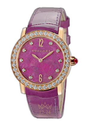 Механизм с автоматическим подзаводом. Корпус из розового золота 18 карат, диаметр 33 мм, бриллианты классической огранки. Циферблат из рубинового цоизита, часовые метки с бриллиантами. Ремешок фиолетового цвета из кожи аллигатора, классическая застежка из розового золота 18 карат. Модель среднего размера.