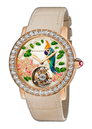 Il Giardino Tropicale Di Bulgari Турбийон с сапфировым мостом, циферблат с ручной росписью. Мануфактурный механизм с автоматическим подзаводом, калибр BVL 263, открытый турбийон с сапфировым мостом. Запас хода 64 часа. Корпус из розового золота, диаметр 37 мм, бриллианты. Заводная головка из розового золота с рубеллитом огранки «кабошон». Лакированный циферблат цвета слоновой кости с узором в виде попугая, цветов и листьев, бриллианты классической огранки. Ремешок из кожи аллигатора, классическая застежка из розового золота.