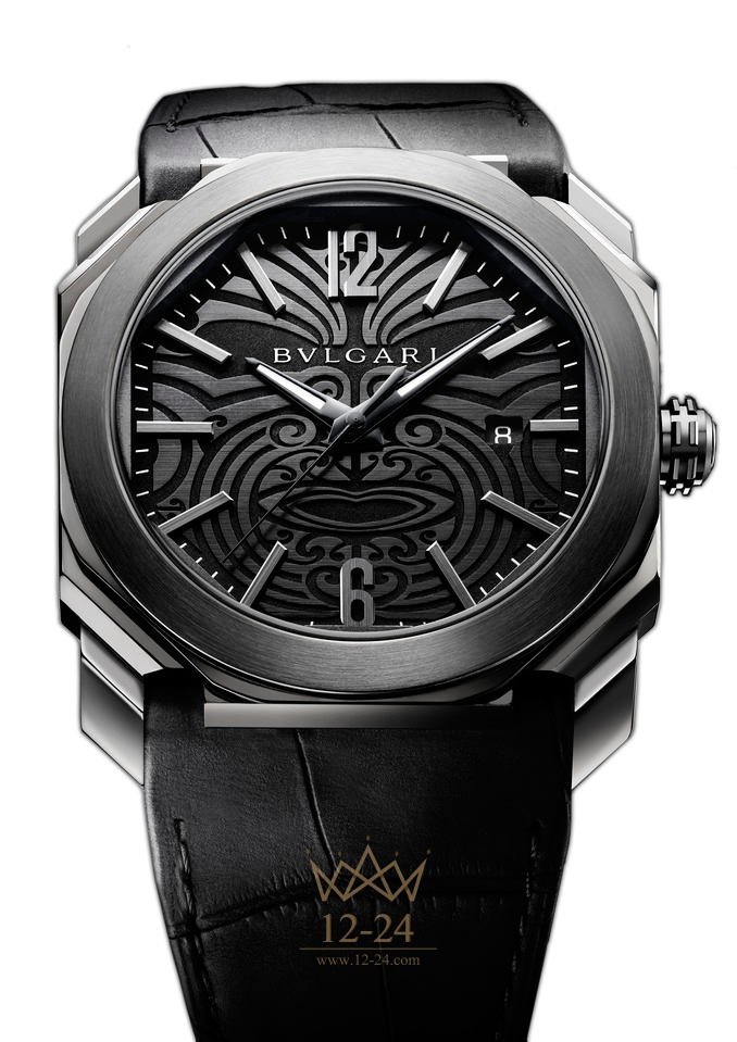 Часы закреплены на крупно-сегментном черном ремешке из кожи аллигатора с пряжкой из нержавеющей стали, обработанной черным покрытием DLC, но на сей раз, ремешок получил каучуковую отделку, которая создает ощущения прорезиненного покрытия без синтетики. Сапфировое стекло дымчатого цвета на задней части корпуса позволяет любоваться элементами декора Côtes de Genève на мостах со снятой фаской или спиральной отделкой основной палеты калибра BVL 193. Этот автоматический часовой механизм, обеспечивающий 50 часов запаса хода, полностью разработан и произведен на мануфактуре Bvlgari. Как и у предшественника, на прозрачном стекле модели изображено оригинальный логотип "All Blacks" 1905.