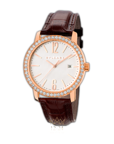 Механизм с автоматическим подзаводом и указателем даты, калибр B77. Запас хода 42 часа. Корпус из розового золота 18 карат, диаметр 40 мм. Безель с бриллиантами классической огранки. Белый циферблат с узором Clou de Paris, наложенные вручную часовые метки. Ремешок из кожи аллигатора, классическая застежка из розового золота 18 карат.