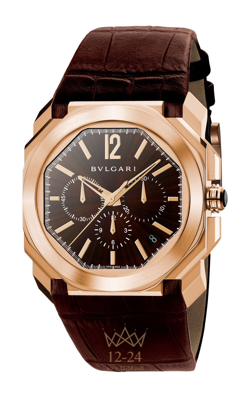 Мануфактурный высокочастотный хронограф (5 Гц)с кремниевым механизмом спуска, автоматическим подзаводом и указателем даты, калибр BVL 328 - Velocissimo с жемчужным зернением, узором Côtes de Genève и скошенными кромками. Запас хода 50 часов. Корпус из розового золота 18 карат, диаметр 41 мм, прозрачная задняя крышка. Заводная головка, отделанная керамикой. Лакированный полированный циферблат, наложенные вручную часовые метки. Интегрированный ремешок из кожи аллигатора, раскладывающаяся застежка из розового золота 18 карат. Водонепроницаемость до 100 метров.