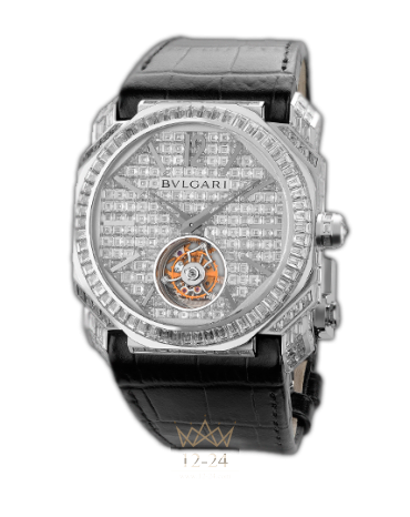 Мануфактурный механизм с автоматическим подзаводом, калибр BVL 263, открытый турбийон. Запас хода 64 часа. Корпус из белого золота 18 карат, диаметр 41 мм, 262 бриллианта багетной огранки. Заводная головка из белого золота 18 карат, 8 бриллиантов багетной огранки, 1 бриллиант классической огранки. Циферблат со сплошным бриллиантовым паве, 178 бриллиантов багетной огранки. Прозрачная задняя крышка. Ремешок из кожи аллигатора, раскладывающаяся застежка из белого золота 18 карат, 35 бриллиантов багетной огранки. Всего бриллиантов: 484.