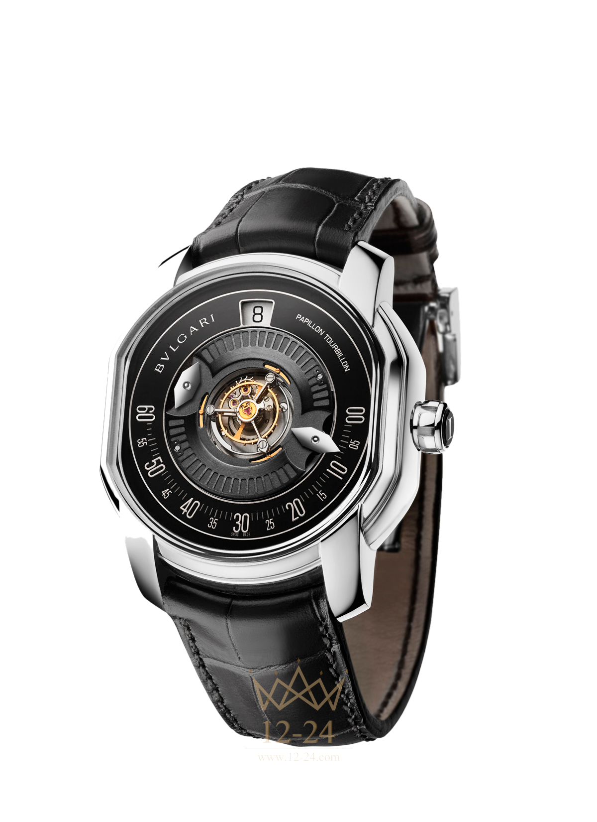 Корпус из платины, прозрачная задняя крышка. Заводная головка из платины 18 карат со вставкой из черного сапфира и выгравированным индивидуальным номером. Диаметр 45 мм, толщина 11,92 мм. Черный лакированный циферблат мануфактурного производства, отверстие над кареткой турбийона, указатель минут в форме бабочки. Черный ремешок из кожи аллигатора, двойная раскладывающаяся застежка из белого золота 18 карат. Ограниченная серия из 10 экземпляров.