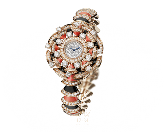 Кварцевый механизм. Корпус из розового золота 18 карат, диаметр 39 мм, бриллианты классической огранки, элементы из оникса и коралла. Циферблат со снежным паве из бриллиантов. Браслет из розового золота 18 карат, бриллианты классической огранки, элементы из оникса и коралла