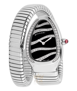 Кварцевый механизм. Изогнутый корпус из стали, диаметр 35 мм, бриллианты классической огранки. Заводная головка из стали, розовый рубеллит огранки «кабошон». Черный лакированный полированный циферблат, бриллианты. Браслет из стали в один завиток, большая модель.