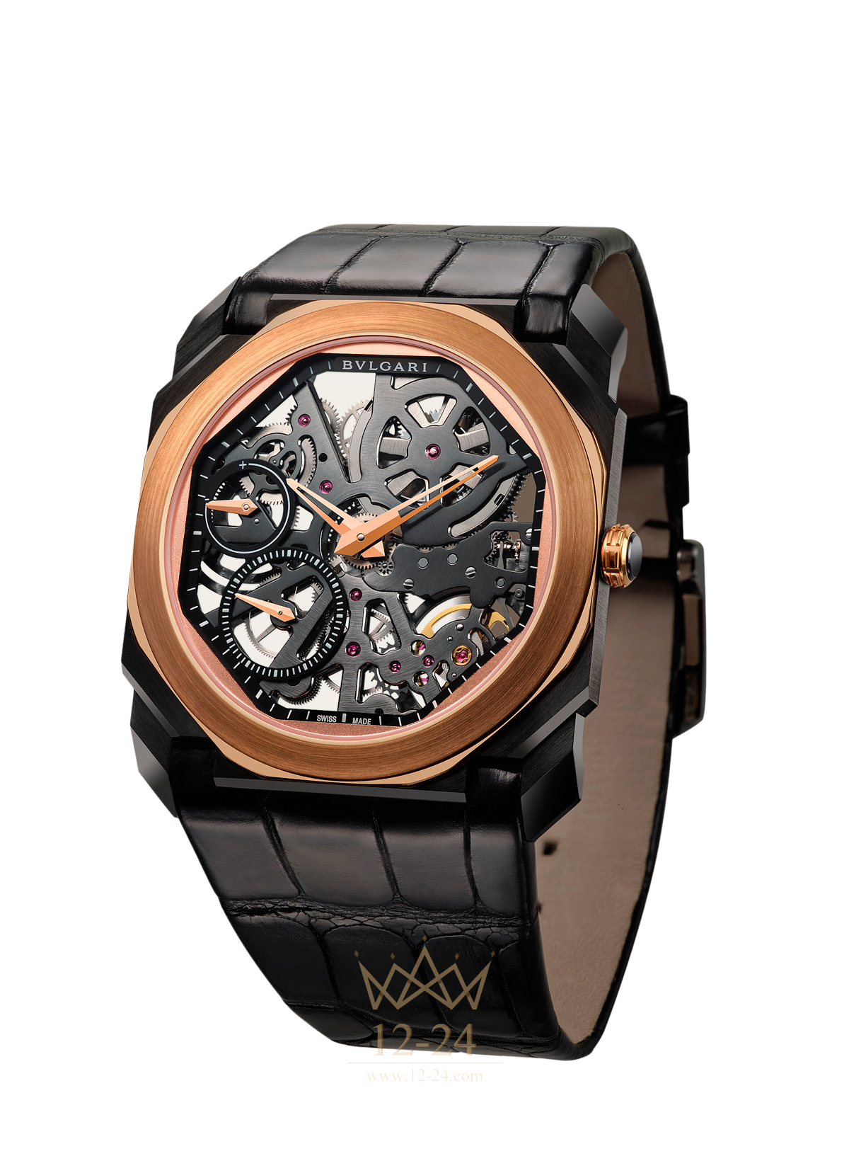 Octo Finissimo Ultranero (102469 BGO40BSPGLXT/SK) — ультратонкий (толщиной 2,35 мм) механический, скелетонизированный, мануфактурный калибр с ручным заводом, малой секундной стрелкой и индикатором запаса хода. Калибр BVL 128SK — Finissimo. Запас хода около 65 часов.