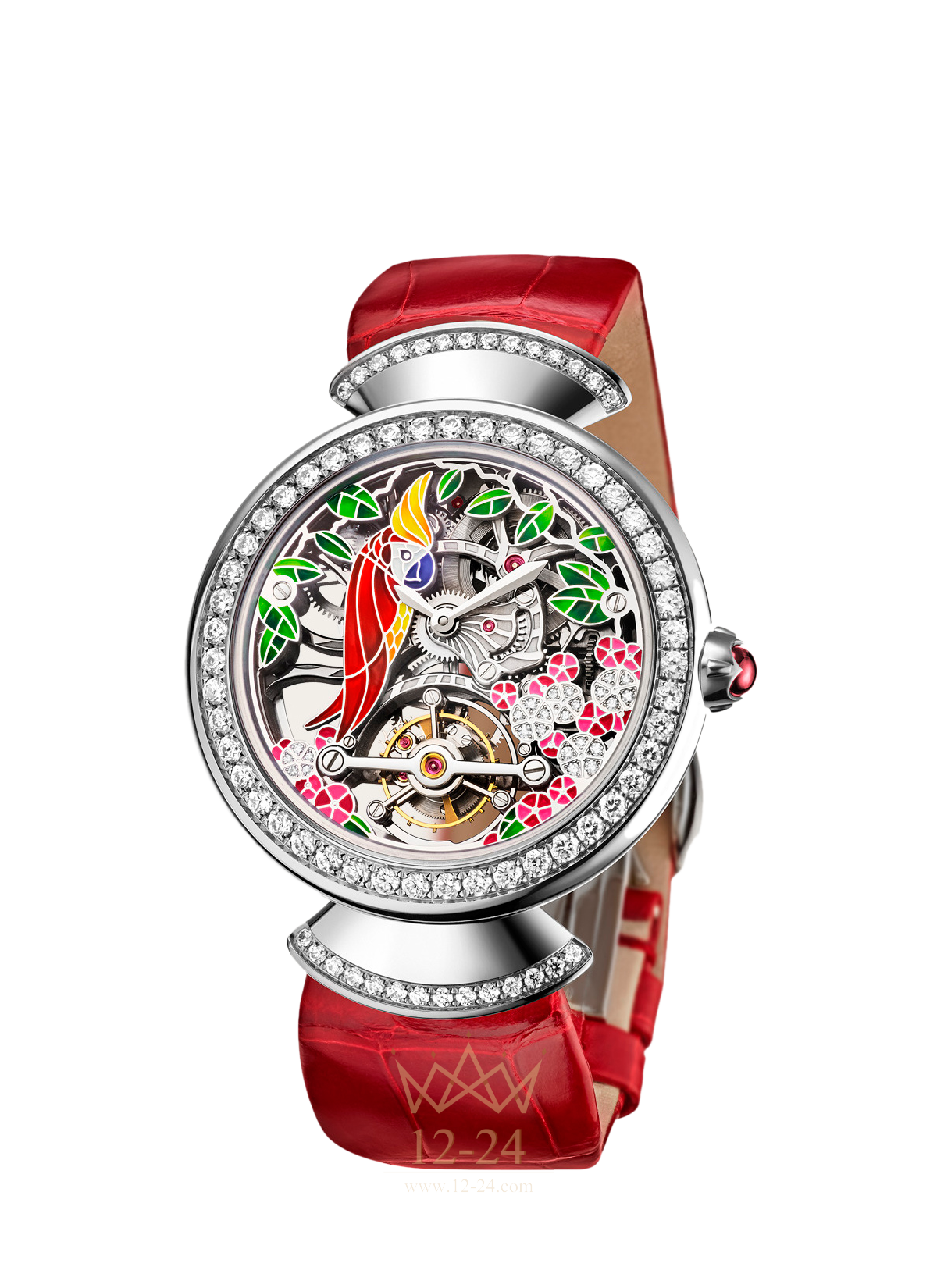 Divas Dream (102517 DVW37PGDLTBSK). Мануфактурный скелетонизированный механизм из белого золота, ручной завод, турбийон. Калибр BVL 208. Корпус диаметром 37 мм из белого золота 18 карат. Циферблат с выполненными вручную мотивами попугая, цветов и листьев, бриллианты. Безель с 76 бриллиантами классической огранки, прозрачная задняя крышка. Синий ремешок из кожи аллигатора, застежка из белого золота 18 карат. Ограниченная серия из 50 экземпляров.