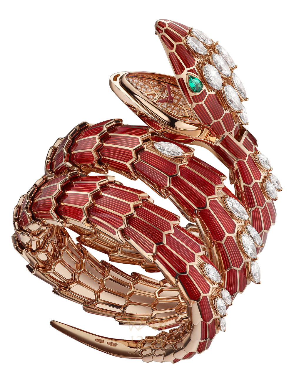 SERPENTI HIGH JEWELLERY. Кварцевый механизм. Изогнутый корпус из розового золота 18 карат, диаметр 40 мм, красный лак, бриллианты огранки «маркиза». Циферблат с бриллиантами классической огранки. Браслет в два витка из розового золота 18 карат, красный лак, бриллианты огранки «маркиза». Глаза из изумрудов.