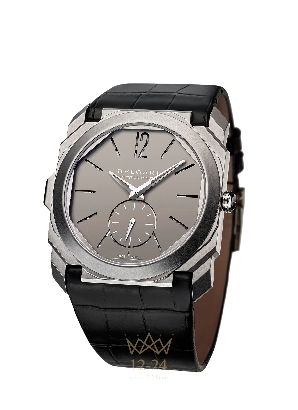 Octo Finissimo Minute Repeater (102559 BGO40BTLMRXT). Самые тонкие из представленных на мировом рынке часов с минутным репетиром: механический мануфактурный калибр BVL 362-Finissimo (толщиной 3,12 мм) с ручным заводом, малой секундной стрелкой, узором «Côtes de Genève», скошенными кромками и жемчужным зернением. Запас хода около 42 часов.