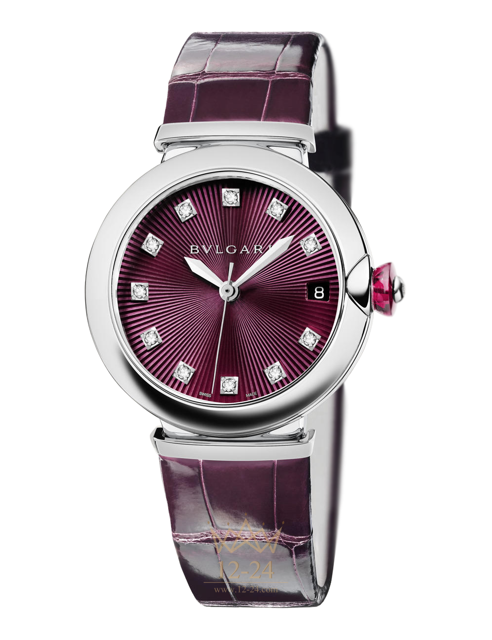 Механизм с автоматическим подзаводом. Корпус из стали, диаметр 36 мм. Заводная головка из стали с розовым камнем огранки «кабошон» и бриллиантом. Фиолетовый циферблат, гильошированный узор «солнечные лучи», часовые метки с бриллиантами. Указатель даты. Фиолетовый ремешок из кожи аллигатора, застежка-пряжка из стали.