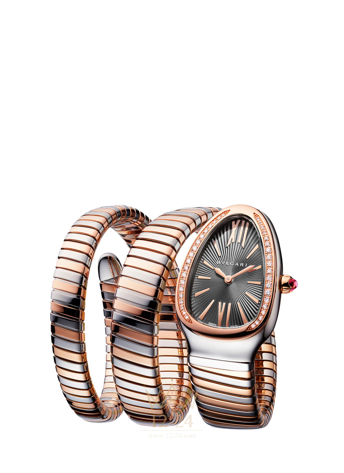 Serpenti Tubogas (102680 SP35C14SPGD.2T). Кварцевый механизм. Изогнутый корпус из стали диаметром 35 мм, безель из розового золота 18 карат, бриллианты классической огранки. Заводная головка из розового золота 18 карат с розовым рубеллитом огранки «кабошон». Серый лакированный циферблат, гильошированный узор «солнечные лучи». Браслет в два витка из стали и розового золота 18 карат.