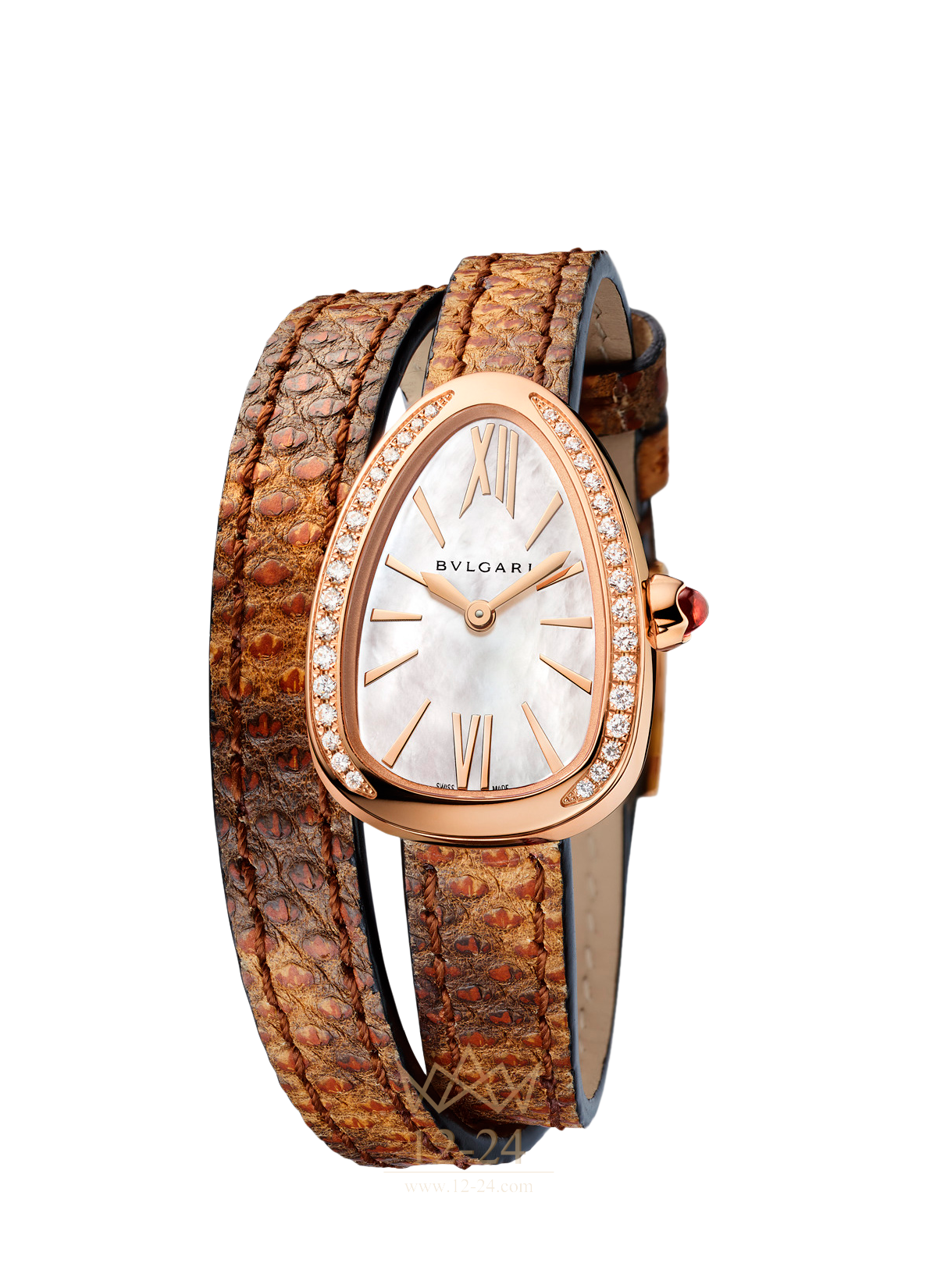 Serpenti Quartz (102727 SPP27WPGDL). Кварцевый механизм. Изогнутый корпус диаметром 27 мм из розового золота 18 карат, бриллианты классической огранки. Белый перламутровый циферблат. Коричневый ремешок в два витка из кожи змеи карунг. Каждый экземпляр часов выпускается с дополнительным ремешком из кожи змеи карунг или телячьей кожи различных цветов.