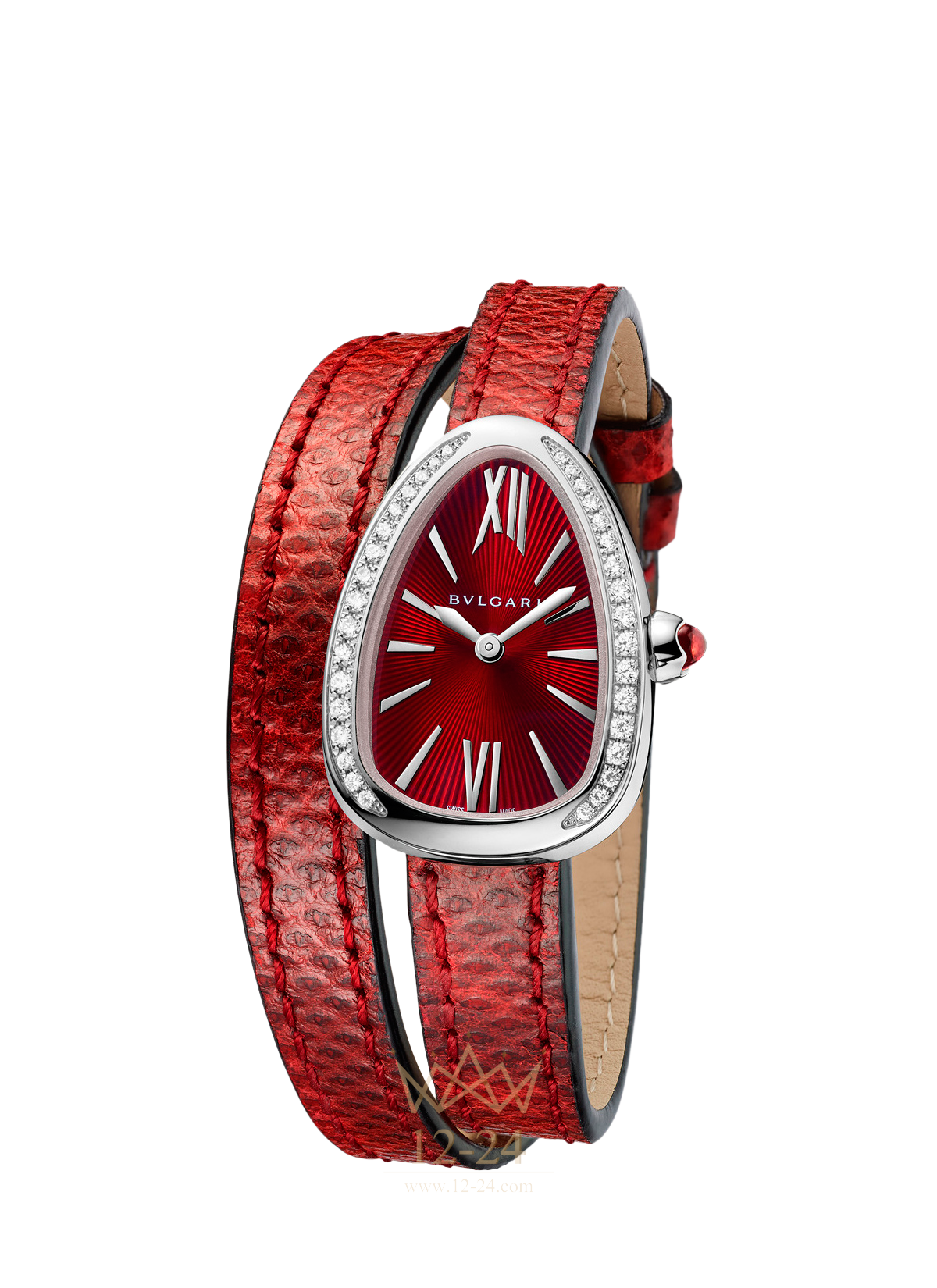 Serpenti Quartz (102780 SPS27C9SDL). Кварцевый механизм. Изогнутый корпус диаметром 27 мм из стали, бриллианты. Красный лакированный циферблат, гильошированный узор «солнечные лучи». Красный ремешок в два витка из кожи змеи карунг. Каждый экземпляр часов выпускается с дополнительным ремешком из кожи змеи карунг или телячьей кожи различных цветов.