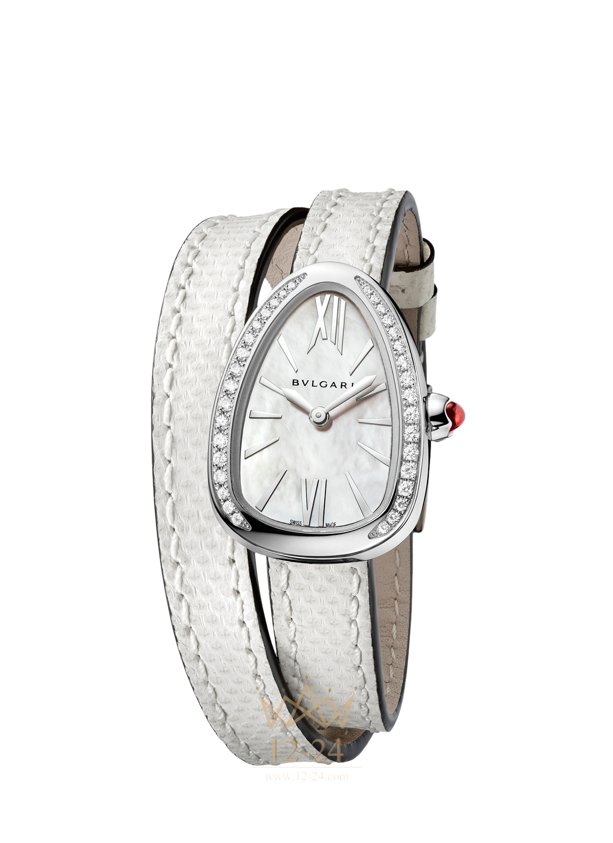 Serpenti Quartz (102781 SPS27WSDL). Кварцевый механизм. Изогнутый корпус диаметром 27 мм из стали, бриллианты. Белый перламутровый циферблат. Белый ремешок в два витка из кожи змеи карунг. Каждый экземпляр часов выпускается с дополнительным ремешком из кожи змеи карунг или телячьей кожи различных цветов.