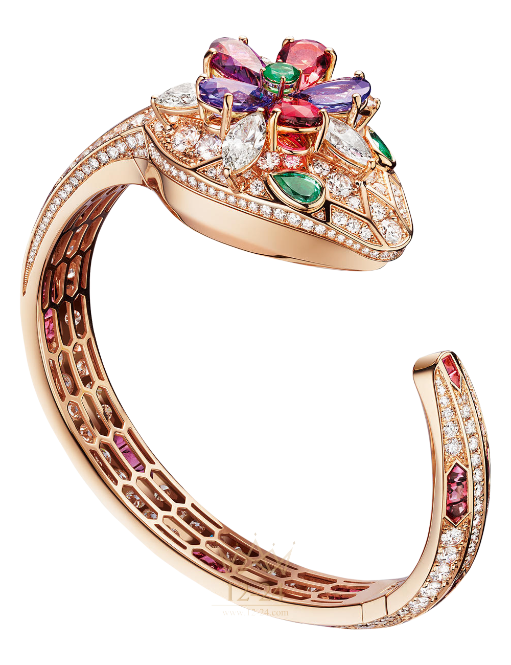 Кварцевый механизм. Изогнутый корпус диаметром 36 мм из розового золота 18 карат. Циферблат из розового золота 18 карат с бриллиантами классической огранки. Голова с бриллиантами классической огранки и огранки «челнок», рубеллитом, турмалинами, танзанитом и фиолетовыми гранатами грушевидной огранки и одним изумрудом круглой огранки. Браслет из розового золота 18 карат с бриллиантами классической огранки и турмалинами багетной огранки. Глаза из изумрудов. Размер 145 мм.