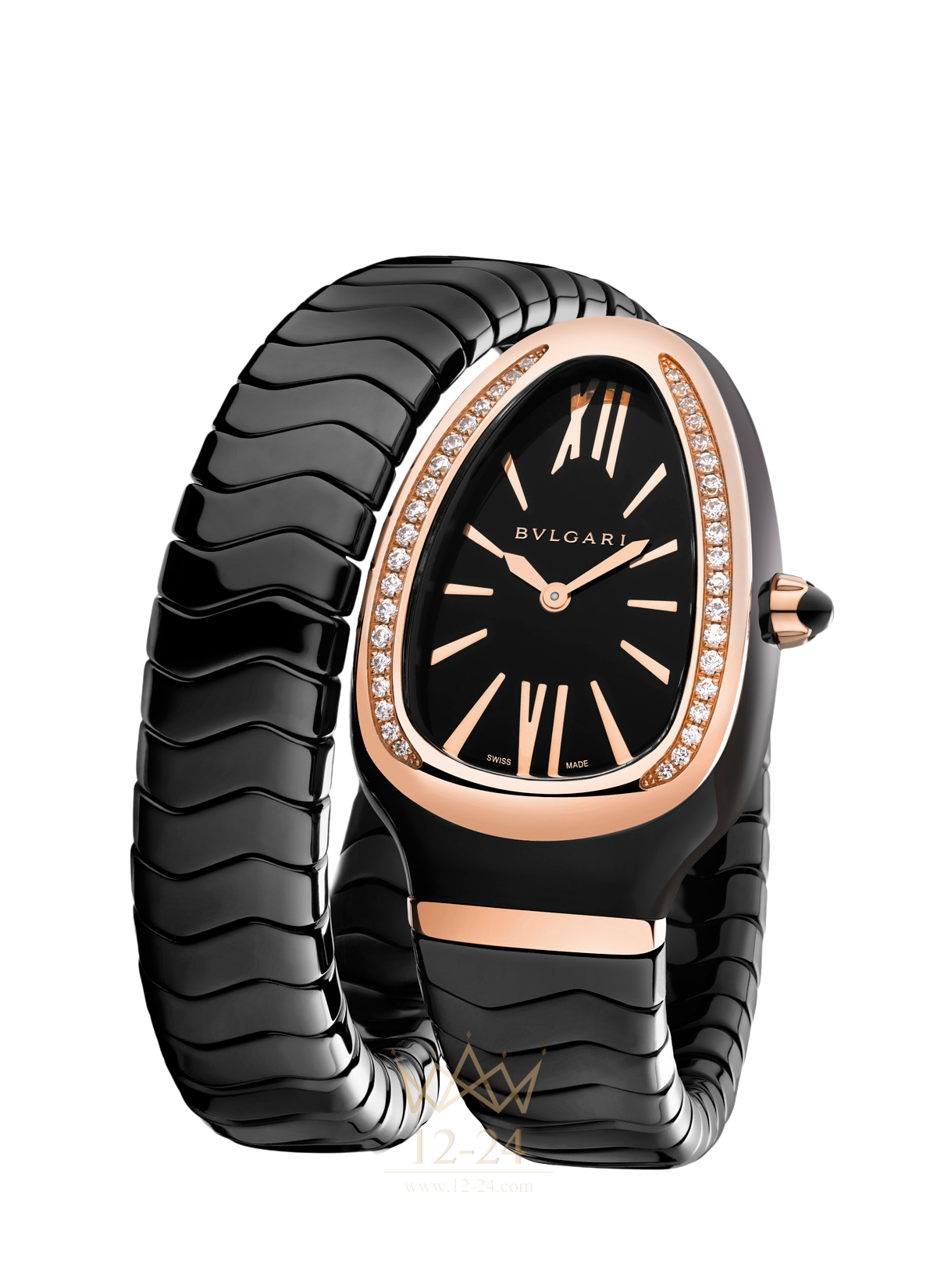 Serpenti Spiga (102532 SPC35BGDBCGD1.1T). Кварцевый механизм. Изогнутый корпус диаметром 35 мм из черной керамики, безель из розового золота 18 карат с бриллиантами классической огранки. Заводная головка из розового золота 18 карат с элементом из керамики огранки «кабошон». Черный лакированный полированный циферблат. Браслет в один виток из черной керамики с элементами из розового золота 18 карат.