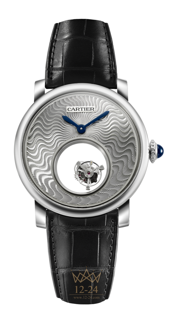 Часы Rotonde de Cartier с двойным «загадочным» турбийоном (CRWHRO0019), 45 мм, механизм с ручным заводом, калибр 9454 MC. Корпус из платины 950 пробы, заводная головка с зернистой отделкой и сапфиром в форме кабошона, гильошированный циферблат из белого золота 18 карат, стрелки в форме мечей из вороненой стали.