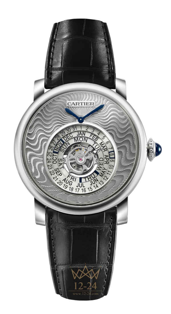 Часы Rotonde de Cartier Astrocalendaire (CRWHRO0020) с турбийоном и вечным календарем, 45 мм, механизм с автоматическим подзаводом, калибр 9459 MC. Корпус из платины, заводная головка из платины с зернистой отделкой и синим сапфиром в форме кабошона, гильошированный циферблат из белого золота 18 карат, стрелки в форме мечей из вороненой стали.