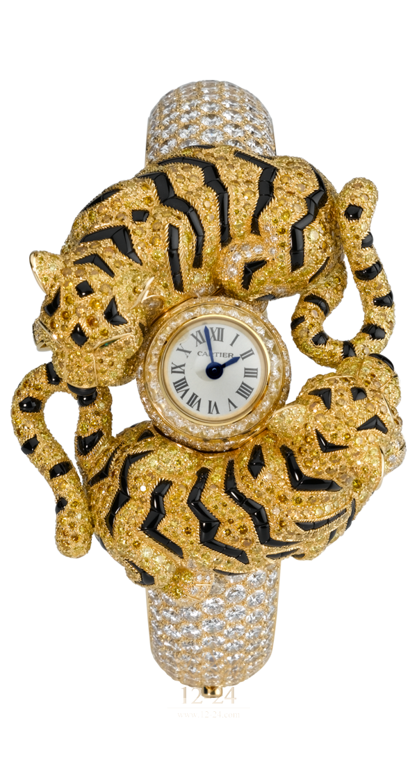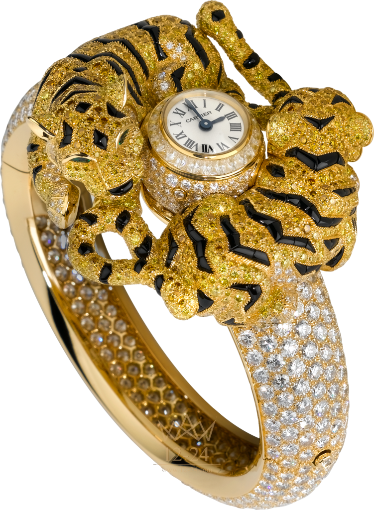 Часы с видимым временем (HPI00249) категории Высокое ювелирное искусство, кварцевый механизм, корпус с мотивом «тигрята» и браслет из желтого золота 18 карат с бриллиантами, бусина.