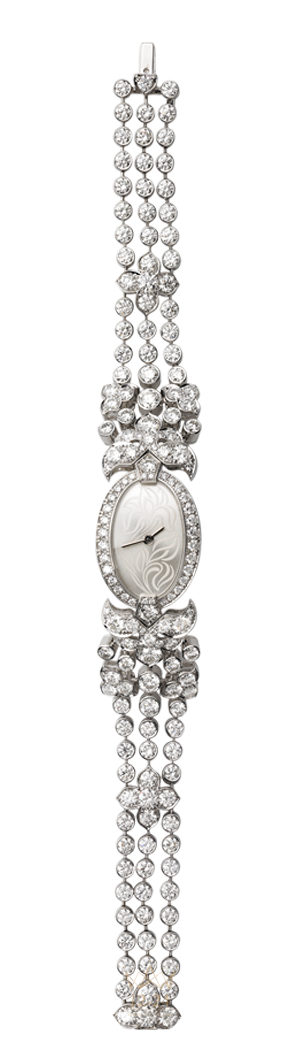 Часы с видимым временем категории Высокое ювелирное искусство, кварцевый механизм, калибр 056, корпус и браслет из белого золота 18 карат с родиевым покрытием украшены 247 бриллиантами, посеребренный циферблат с узором “солнечные лучи”, прозрачным лаком и декалькированным белым цветочным мотивом, стрелки в форме мечей из белого золота 18 карат с родиевым покрытием, сапфировое стекло, водонепроницаемость до 30 метров.