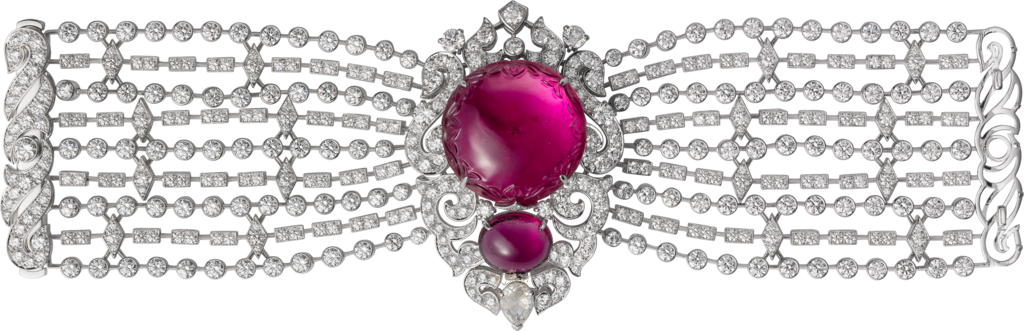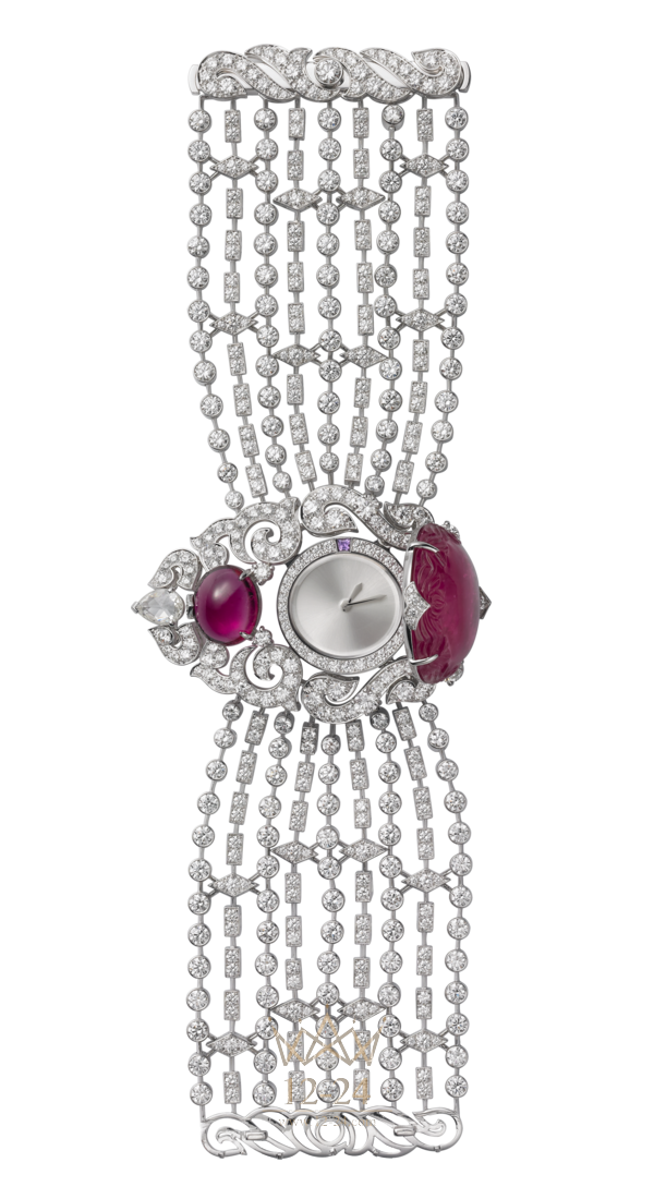 Часы со скрытым временем категории Высокое ювелирное искусство (HPI00460), кварцевый механизм, корпус и браслет из белого золота 18 карат с родиевым покрытием, 1 гравированный рубеллит в форме кабошона весом 46,65 карата, 1 грушевидный бриллиант огранки «роза» весом 0,78 карата, 478 бриллиантов общим весом 26,27 карата, метка «12 часов» из розового сапфира, посеребренный циферблат с узором «солнечные лучи» и покрытием из прозрачного лака, стрелки в форме мечей из золота 18 карат с родиевым покрытием, водонепроницаемость до 3 бар (30 метров), единственный экземпляр.