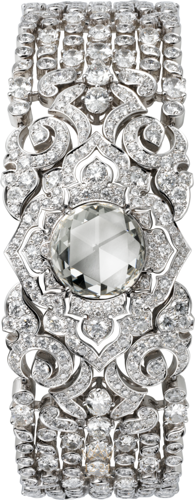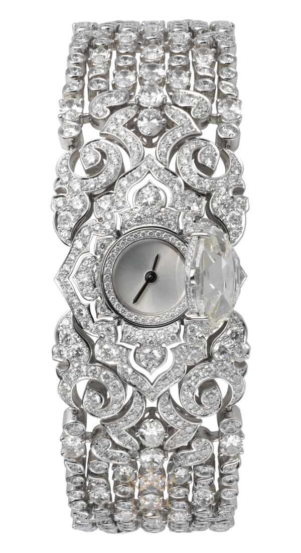 Часы категории Высокое ювелирное искусство со скрытым временем (HPI00467), кварцевый механизм, корпус и браслет из белого золота 18 карат с родиевым покрытием, круглый бриллиант огранки «роза» весом 9,01 карата, 30 овальных бриллиантов общим весом 5,95 карата, 2 грушевидных бриллианта общим весом 0,61 карата, 495 бриллиантов классической огранки общим весом 11,07 карата.