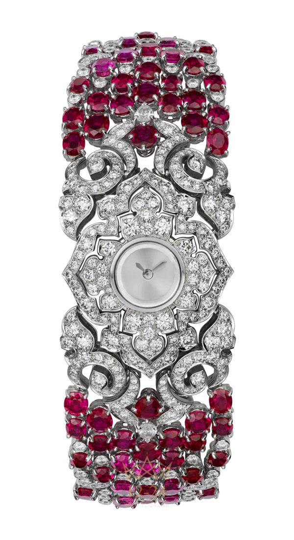 Часы с видимым временем категории Высокое ювелирное искусство (HPI00468), кварцевый механизм, корпус и браслет из белого золота 18 карат с родиевым покрытием украшены 54 рубинами овальной огранки общим весом 21,85 карата, 2 бриллиантами огранки «груша» общим весом 0,33 карата и 371 бриллиантом общим весом 9,84 карата, Белый посеребренный циферблат с узором «солнечные лучи» и покрытием из прозрачного лака, стрелки в форме мечей из желтого золота 18 карат с родиевым покрытием. Водонепроницаемость до 30 метров, единственный экземпляр.
