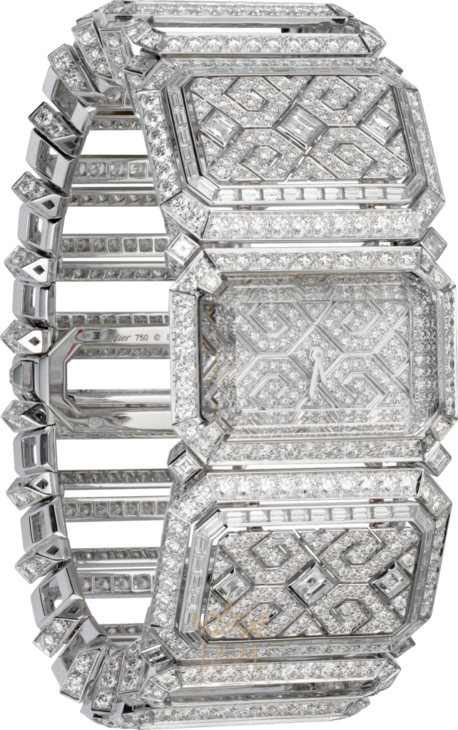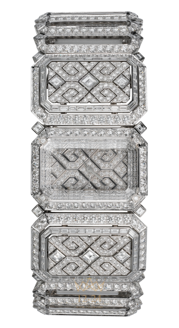 Часы с видимым временем категории (HPI00541) Высокое ювелирное искусство, кварцевый механизм, корпус и браслет из белого золота 18 карат с родиевым покрытием украшены 64 бриллиантами багетной огранки общим весом 2,04 карата, 42 бриллиантами квадратной огранки общим весом 0,8 карата, 1143 бриллиантами классической огранки общим весом 22,65 карата.